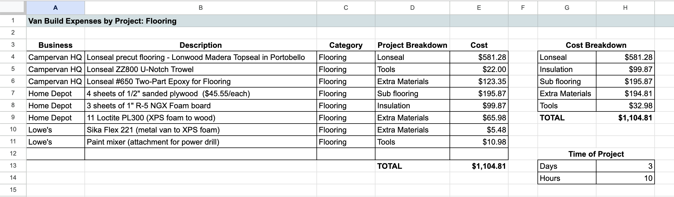 We love transparency and a good budget! Just like we shared our monthly expenses around America’s Great Loop, we’re compiling all of the costs for our entire van build and also breaking them down project by project. Installing insulation, subflooring, and our Lonseal flooring cost us a total of $1,104.81. We typically don’t include most tools, like power drills, saws, exacto blades, etc., in this list because we use them for several projects throughout the van build.