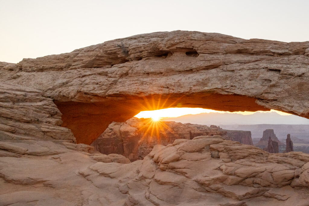 The Mesa Arch Trail is a perfect way to start your day in Canyonlands, whether you’re up before dawn to catch the sunrise or prefer to sleep in a bit and explore once the sun’s already up. Photographers flock to this famous arch daily to capture the sun as it wedges itself above the horizon and under the arch achieving a sun flare (as seen in the photo below)! Although we highly recommend making it for sunrise, you can do this gorgeous, 20-minute loop at any point in the morning.