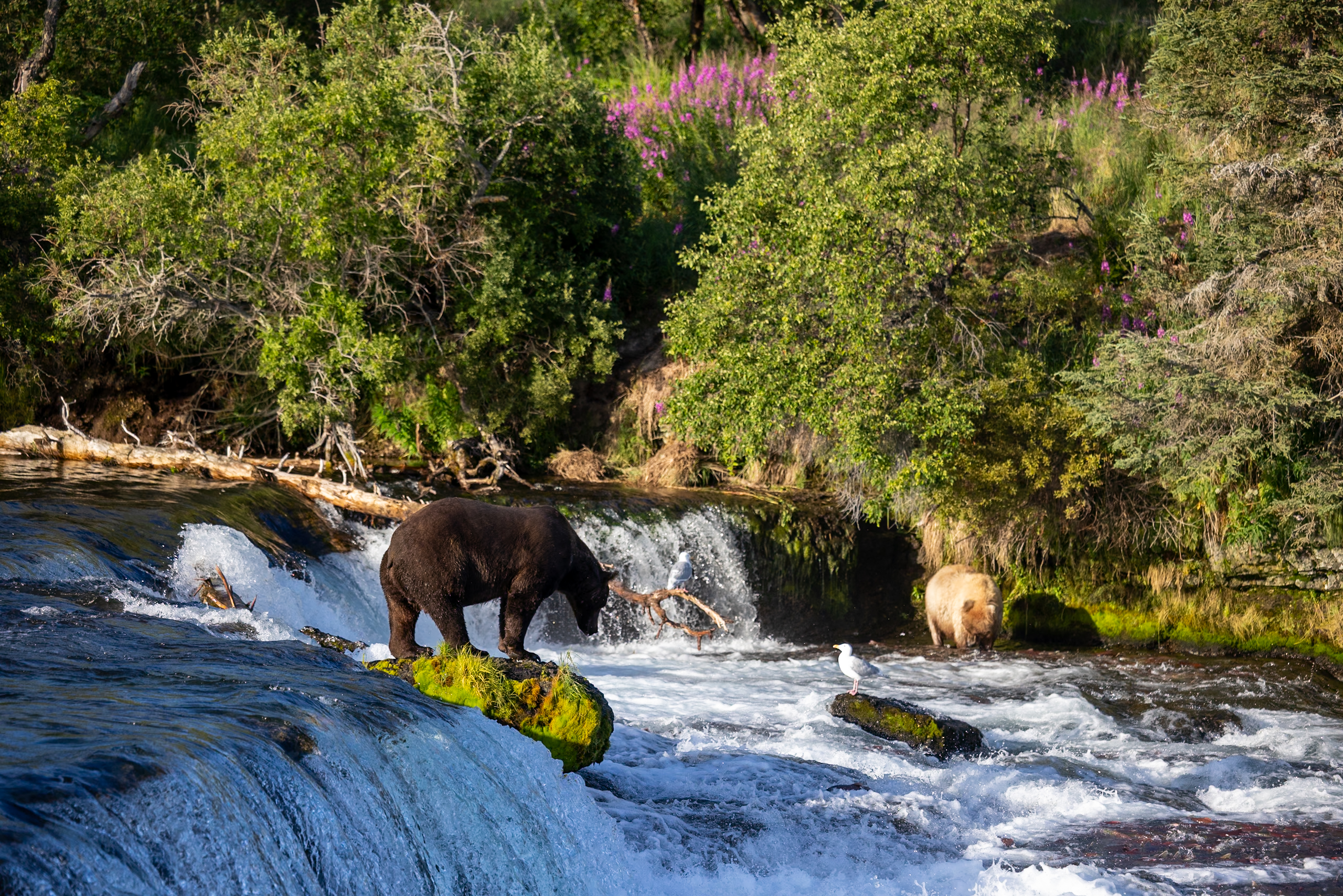 Katmai National Park in southwestern Alaska was originally established to protect the volcanic Valley of Ten Thousand Smokes. Nowadays, this remote park is best known for its thriving brown bear population, particularly in the Brooks Camp area. Each July, during peak salmon season, visitors gather at Brooks Falls to witness the bears feast on leaping salmon making their way upriver.