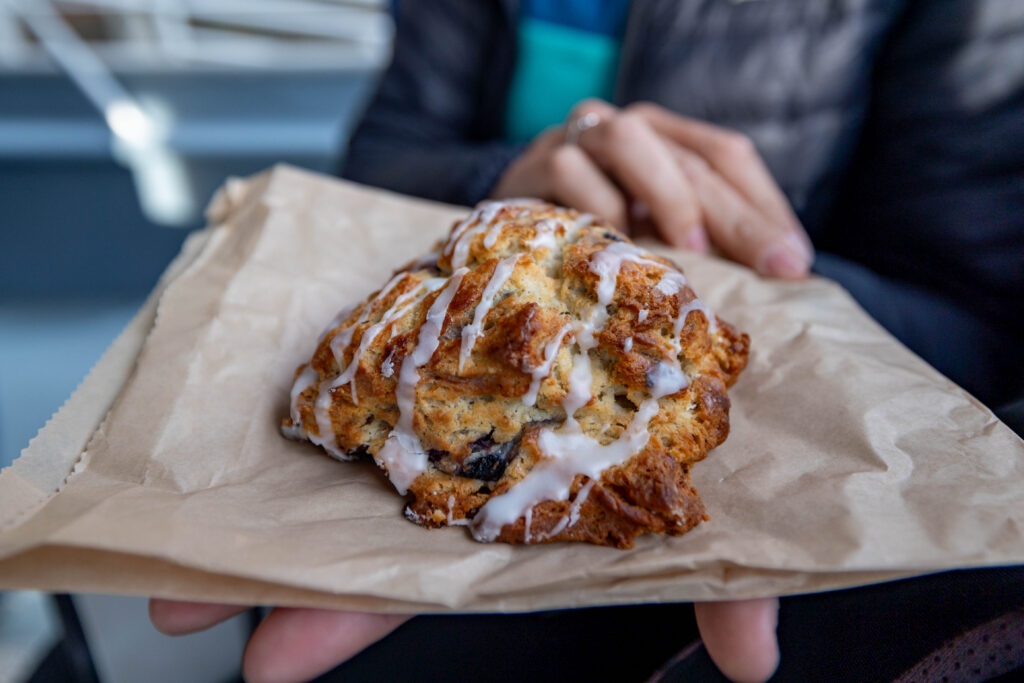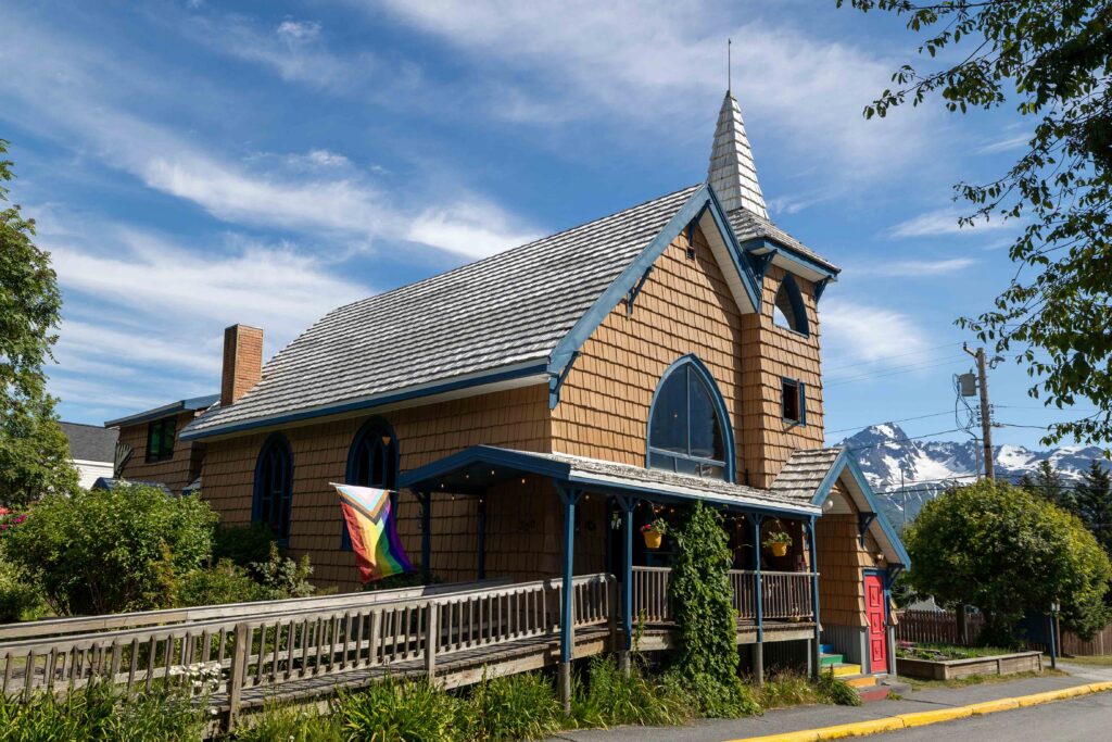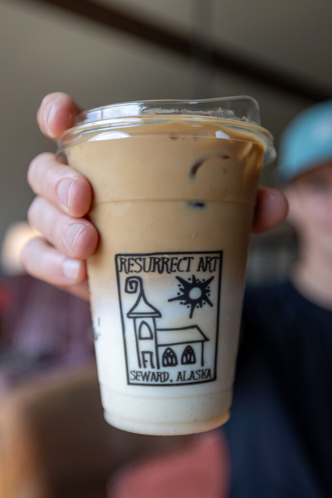 Head over to Resurrect Art Coffee House, a funky work-friendly café and art gallery located inside an old church in downtown Seward! This local favorite is open daily from 7 AM to 5 PM and is a great place to start your day, get some work done, or relax with a book. We ordered iced coffees and some of their baked goods, and they were both delicious!
