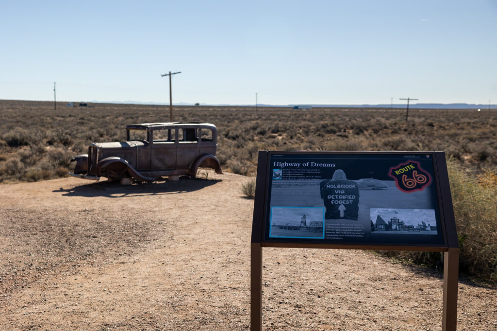 The historic Route 66 actually passes right through Petrified Forest National Park, and is the main attraction from miles 5 to 10 of the road. This is how travelers used to reach the park, and it’s also what determined the location of the Painted Desert Inn. We got to see a 1932 Studebaker car as well as the old power lines where Route 66 used to be. It was really cool to imagine what this area was like back in its heyday.