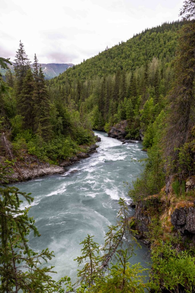 - Sixmile Creek Hanging Bridge: Just before turning off if you were to go to Hope, Alaska, there’s a short hike to a hanging bridge right off of Alaska 1 (pinned on the map). This is a great spot to stretch your legs!