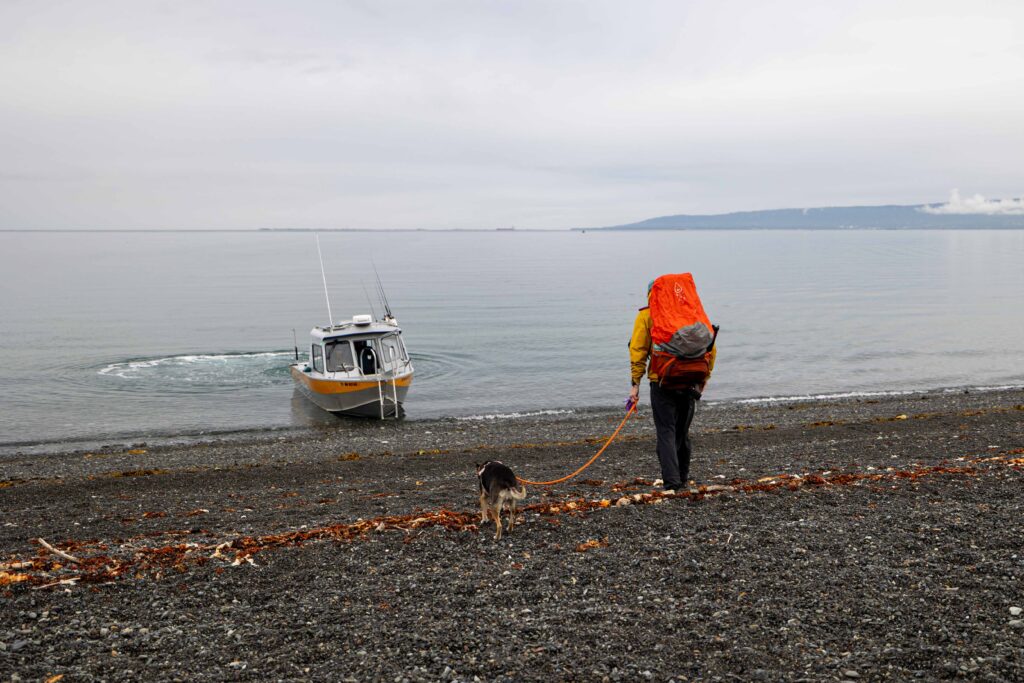 We decided to go on our first backpacking trip here, crossing the bay with Ashore Water Taxi at 9 a.m., and returning the following day at 11 a.m. This gave us the perfect window to hike the Grewingk Lake, Grewingk Tram, and Saddle Trails (trail map below) and camp overnight by a glacier! Round-trip, this taxi costs $85 per person and includes the park entrance fee.