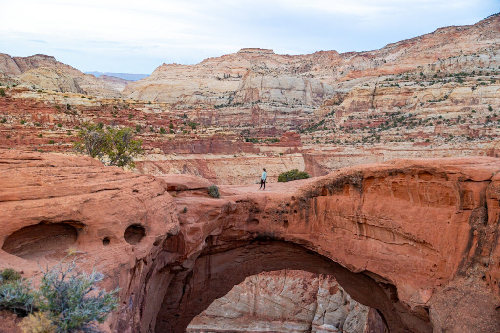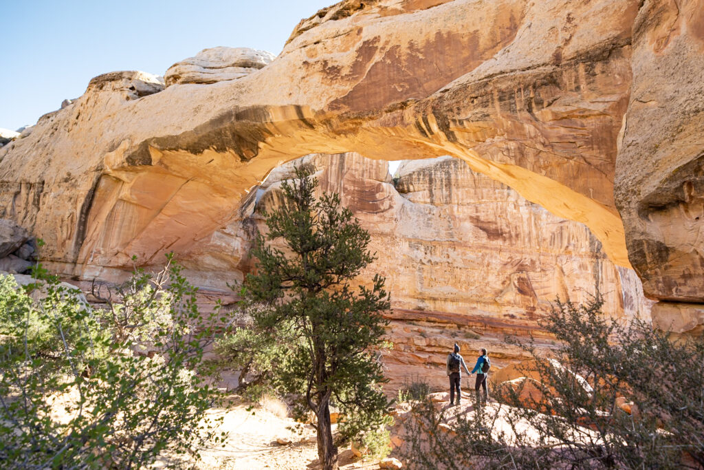 Start your day off bright and early by hitting Capitol Reef’s #1 trail, the Hickman Bridge Trail. This 1-hour, moderate hike is incredibly popular, so the trailhead parking lot can fill up as early as 9:30 AM. We highly recommend setting out before sunrise to secure a spot and start making your way to Hickman Bridge. This trail is stunning at sunrise, so make sure to start hiking early.